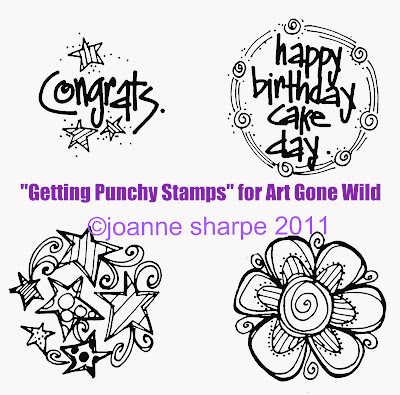 These were made with the "Getting Punchy" sets. The set comes with FOUR 3" stamps, the images designed for the Marvy PURPLE PUNCHES (available at Michaels Stores). But of course you can stamp you own repeating patterns as they stand along well. (*i posted all the PUNCHES sets in my January 21 blog post)